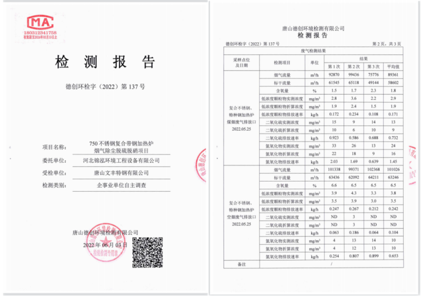 唐山文豐特鋼有限公司750不銹鋼復(fù)合帶鋼加熱爐煙氣除塵脫硫脫硝項(xiàng)目是河北錦泓環(huán)境工程設(shè)備有限公司于2021年10月份投建完成,項(xiàng)目從開(kāi)工到建設(shè)完成歷時(shí)僅2個(gè)月。本項(xiàng)目采用的加熱爐煙氣治理工藝為SDS干法脫硫+布袋除塵+SCR脫硝,實(shí)現(xiàn)設(shè)計(jì)的排放濃度,SOx濃度<20mg/Nm3。出口NOx濃度<50mg/Nm3,預(yù)留<30mg/Nm3。煙氣粉塵顆粒物指標(biāo)<5mg/Nm3。