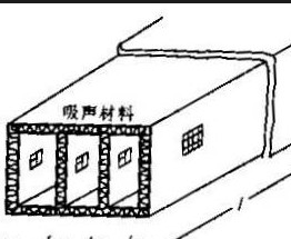 ? ? 迷宮式消聲器也稱室式消聲器。在輸氣管道中途,例如,在空調(diào)系統(tǒng)的風(fēng)機(jī)出口、管道分支處或排氣口,設(shè)置容積較大的箱 ( 室 ) ,在它里面加襯吸聲材料或吸聲障板,就組成迷宮式消聲器,如圖所示。這種消聲器除具有阻性作用外,通過(guò)小室斷面的擴(kuò)大與縮小,還具有抗性作用,因此消聲頻率范圍較寬。?