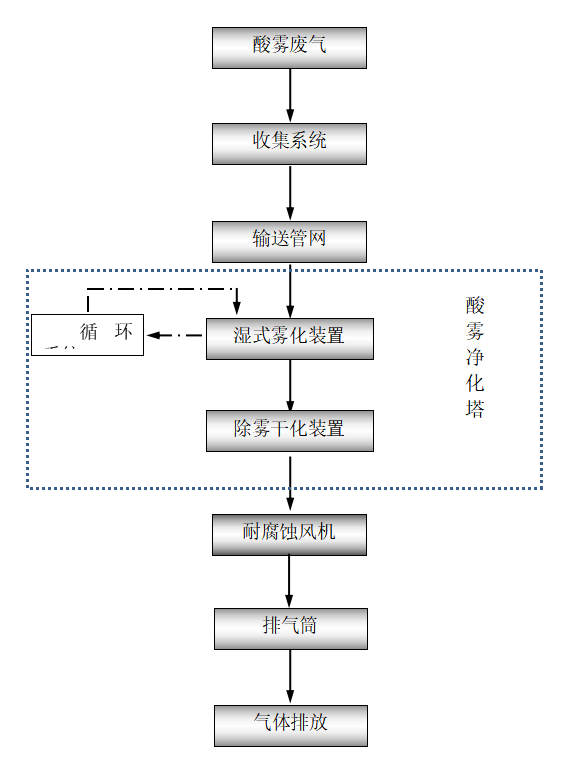 酸洗車(chē)間工藝產(chǎn)生的酸霧廢氣在耐腐蝕風(fēng)機(jī)引起的負(fù)壓作用下,經(jīng)收集系統(tǒng)收集后經(jīng)輸送管網(wǎng)接入濕式霧化裝置底部,氣體由下向上,堿性吸收液由循環(huán)裝置通過(guò)布液設(shè)備以霧狀或小水滴均勻向下噴淋,氣液兩相在多面球填料形成逆流充分接觸反應(yīng),此填料具有表面積大,空隙率高,傳質(zhì)性能好的優(yōu)異性能,經(jīng)霧化后的吸收液均布在多面球填料上,液氣充分接觸吸收,有效捕捉廢氣中的污染物,從而除去酸霧中的硝酸及鹽酸。除去酸霧后的濕潤(rùn)氣體經(jīng)除霧干化裝置除去水霧后,經(jīng)排放煙囪直接排放。