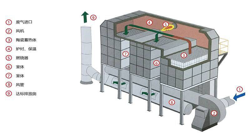 RTO廢氣處理設(shè)備的工作原理是在高溫下將廢氣中的有機(jī)物(VOCs)氧化成對(duì)應(yīng)的二氧化碳和水,從而凈化廢氣,并回收廢氣分解時(shí)所釋放出來的熱量,三室RTO廢氣分解效率達(dá)到百分之99以上,熱回收效率達(dá)到百分之95以上。RTO廢氣處理設(shè)備主體結(jié)構(gòu)由燃燒室、蓄熱室和切換閥等組成。RTO廢氣處理設(shè)備可以根據(jù)客戶實(shí)際需求,選擇不同的熱能回收方式和切換閥方式。